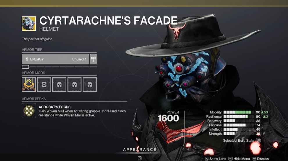 This is it; the Exotic helmet, I would argue, is one of your best choices as a Strand Hunter. It synergizes incredibly well with many aspects of the subclass due to how it grants Woven Mail whenever you Grapple something. Better yet, it is how good Woven Mail is. If Tier 10 Resilience grants a 30% damage resist and Woven Mail grants 60%, then you will be surprised that the two stack multiplicatively. For example, if you have Woven Mail and Tier 7 Resilience, that comes to 68.4% damage resist. While Tier 10 with Woven Mail tops you out at a whopping 72% resistance.