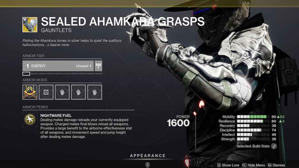 Perk-wise, these gauntlets give you the ability to reload your weapon whenever you deal melee damage. Even better is that powered melee final blows will reload every weapon in your inventory on top of greater mobility, jump height, and airborne effectiveness for five seconds after melee damage. You might think that as a Strand Hunter, these would work well with the Hunter’s homing Threaded Spike melee. Unfortunately, between the perk’s seven-second cooldown and the Exotic arms not benefiting Strand Hunters in other ways that elevate the subclass’s strengths, these are at the bottom of the list.