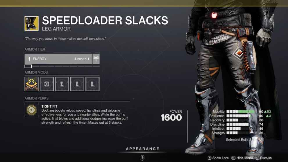 Unlike the Ahamkara Grasps, these sleek slacks are designed to help you reload faster with more handling and greater airborne effectiveness. All you have to do is use your dodge to get all those benefits. Additionally, when you and your fireteam are within 15 meters, you get it for 15 seconds. The buff can also be refreshed upon additional dodges and kills, which makes it useful when moving through missions or the Crucible as long as you’re getting kills—not so much for boss encounters unless you can chain add kills with more dodges.