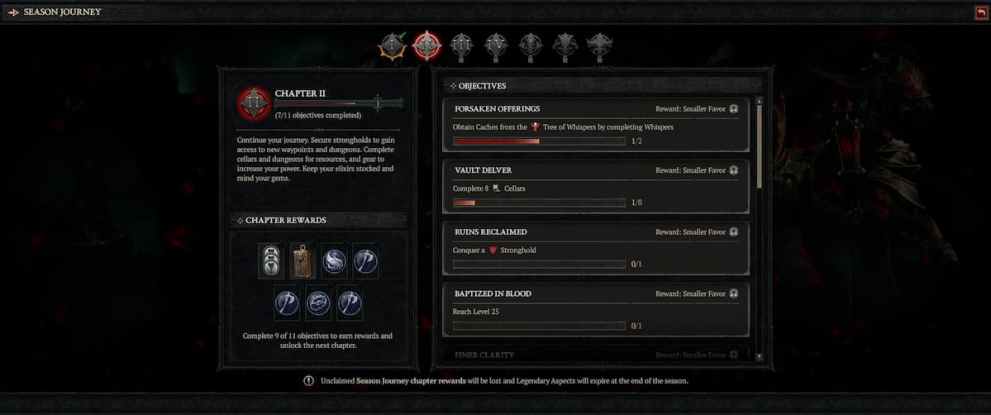 Similar to the Summons of the Deathless quest in Diablo 4 Season 2, A Witness in the Dust requires you to complete chapter 2 of your Seasonal Journey. After clearing the Fetid Mausoleum dungeon with Hunter Erys, you’ll be tasked with completing chapter 2, which means knocking out various objectives and activities you can do in the game.