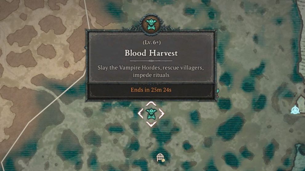 To see where a Blood Harvest event is happening in Diablo 4, all you do is open your world map. You’re looking for a zone colored teal, and if you’re colorblind, look for a skull icon. It looks similar to Strongholds, so just hover your cursor over it and it’ll say whether it’s a Stronghold or a Blood Harvest Event.