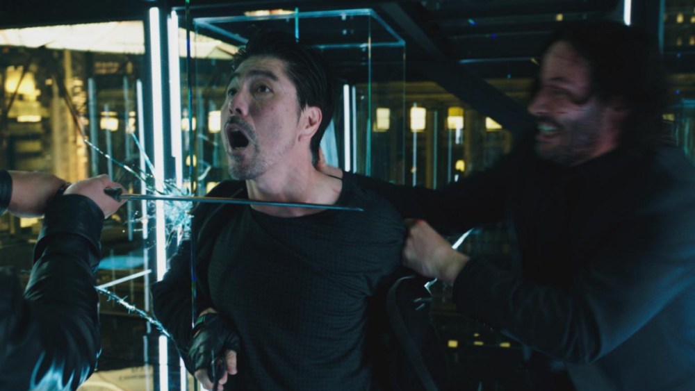 John turns the tide by using the numbers game against them, holding one as a human shield in order to attack the other. After getting slammed into the glass multiple times, it’s very pleasing to see John use the same glass to evade attacks and cause the assassins’ demise. The best part arrives when he makes the first assassin slit the throat of his friend, followed by taking his katana to finish him off. It’s a see-saw affair with the best payoff at the end.