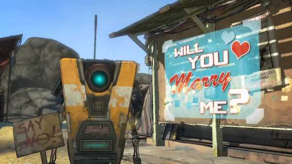 The developers at Gearbox responded by creating a hilarious scenario where Claptrap films a very reluctant proposal video for Ben, arguing with an off-screen director about the happy couple, when not trying to hit on Tora himself.