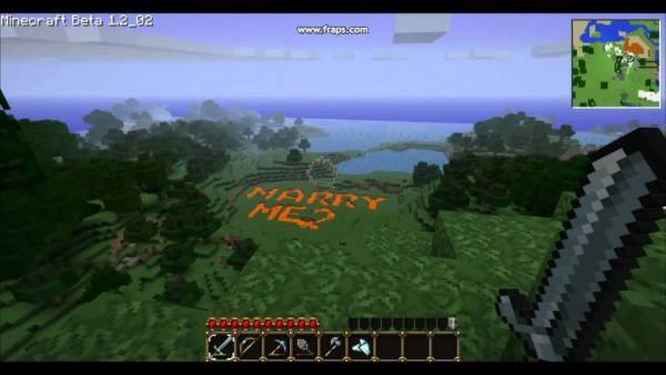 In 2011 an employee of Bioware used the game to propose by writing “Marry Me?” in Minecraft’s most romantic material, lava. The message is viewable from a high vantage point, to which the creator’s girlfriend is guided by signposts.
