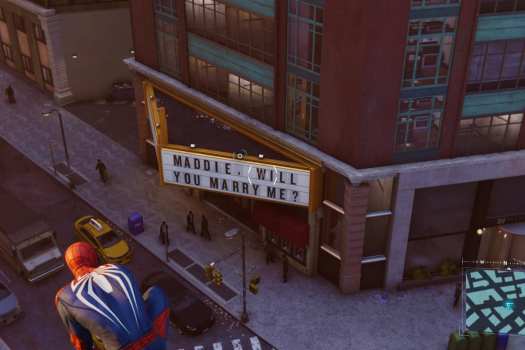 In May last year, Tyler Schultz tweeted at Insomniac asking for help in proposing to his girlfriend. Insomniac and Marvel loved the idea and worked the message “Maddie, Will You Marry Me?” onto a movie theatre marquee in the game.