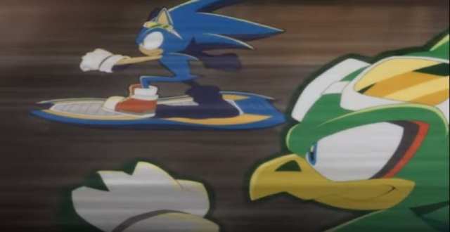 Without Extreme Gear of his own, Sonic pursues the avian band of thieves using one of their boards and inadvertently starts butting heads with Jet, who is impressed by Sonic’s speed but nevertheless catches him by surprise by knocking the wind out of him and leaving him in the dust, Chaos Emerald in hand.