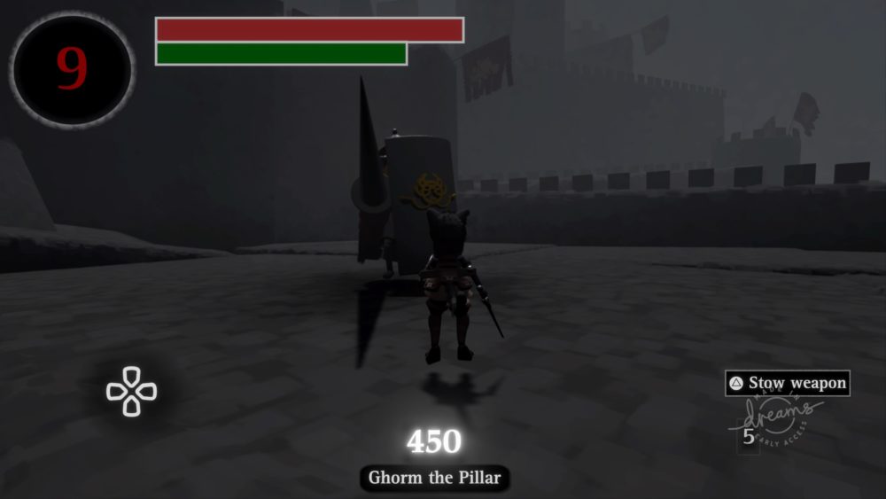 The first and only boss is Ghorm the Pillar, an appropriately named large knight who has a simple moveset but a lot of HP, which is shown at the bottom of the screen in the center of the hud.