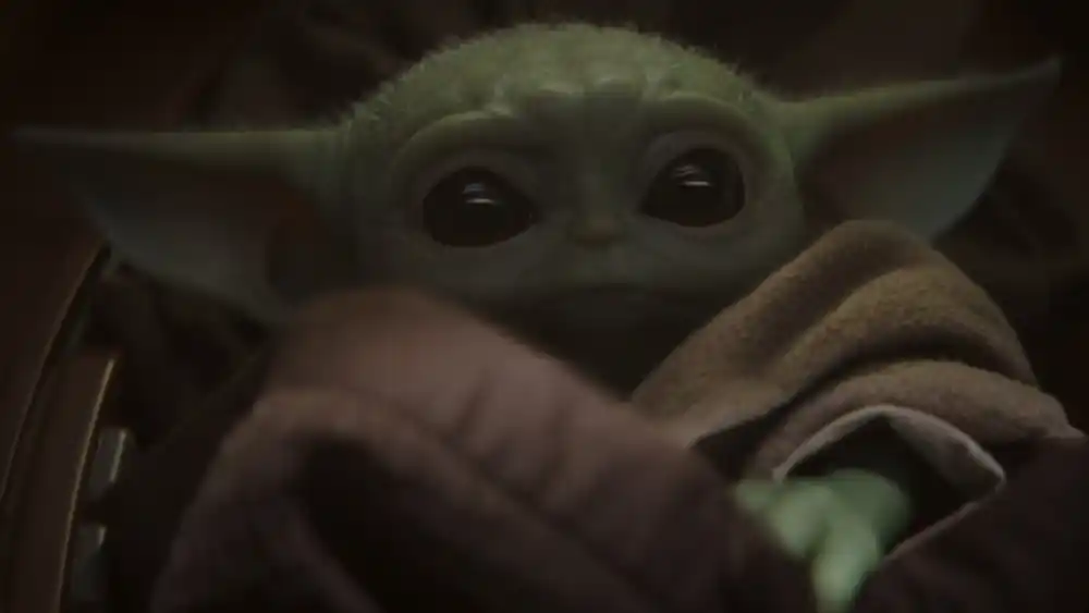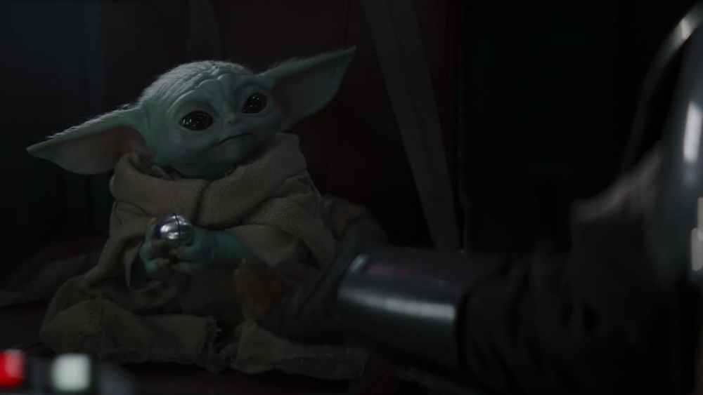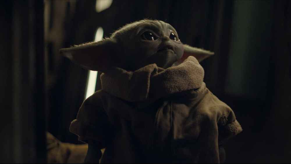 The Mandalorian safely secures the child and leaves him behind on board, only to find himself in a set-up and tricked by Ranzar Malk’s nefarious crew. One double-crossing crew member Zero, who’s a killer droid and pilot, finds the child and aims to shoot. The petite Grogu bravely raises his arms toward Zero, and the droid’s head explodes. His delightful shock at his Jedi powers causes him to stare at his hands in wonderment. Although it turns out the Mandalorian blasted Zero from behind, Grogu’s reaction remains cute nonetheless.