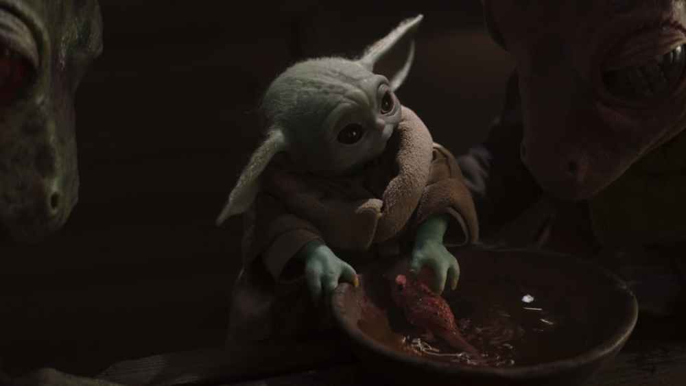Fairy or unfairly, the fictional made-up character Grogu did get heat for his appetite, but he is just too cute. He even stopped the Mandalorian and Cara Dune from killing each other just by slurping his bowl of soup. That said, the hungry kid does eventually stop eating a container of endangered space frog eggs that the Mandalorian helps transport. Grogu’s cuteness magnifies just like his face through the aquarium glass housing these eggs, his enlarged mug lighting up as an egg hatches. Towards the episode’s end, he sits between space frog parents and rubs the newly hatched frog in a bowl of water.