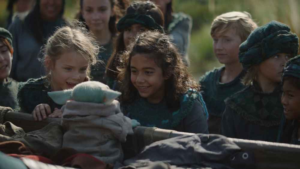 According to his creed, the Mandalorian should never show his face to someone else. However, the series introduces a village and teases it as being a place where he can be at peace with a simple life. On the planet Sorgan, a village girl named Winta asks to feed and play with the child. Grogu endears himself to the village children, playing games and spitting out a live frog to their amusement.