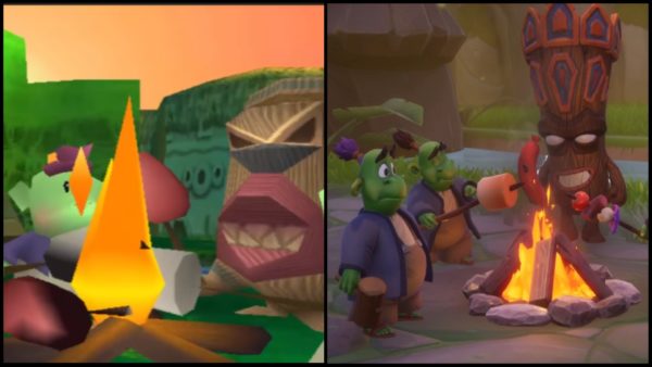 Particularly, the image above is from an early level called Idol Springs in Ripto’s rage. As you can see, the general design of the tiki enemies has been totally changed, although the other characters still somewhat resemble their original counterparts. Of course, it’s also the perfect example at how far video game fire has come.