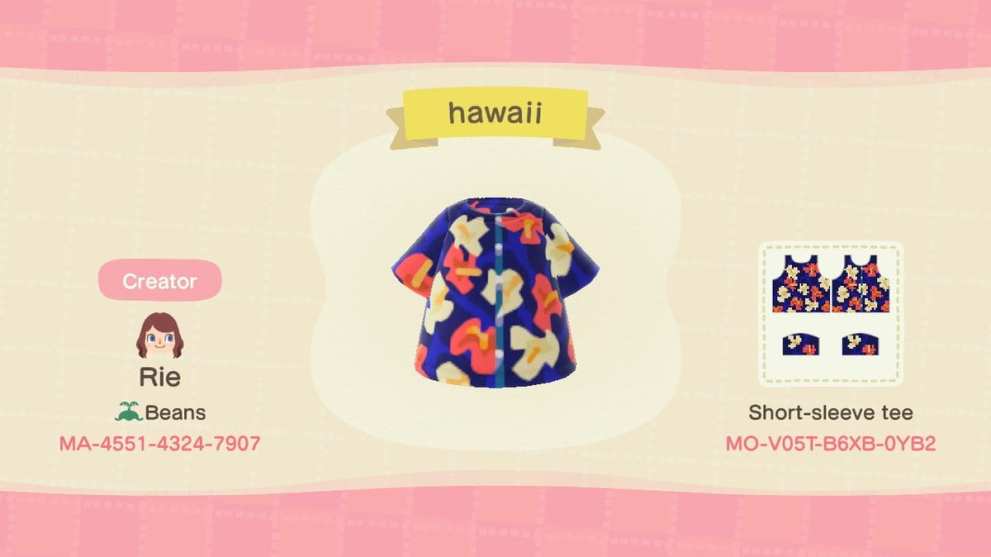 There’s nothing like a breezy Hawaiian to go with a hot summer day, and creator Rie has made this cool top to satisfy that very combo. The Custom Design Code is MO-V05T-B6XB-0YB2.