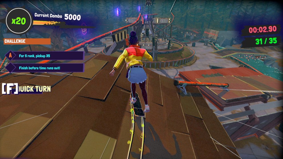 The Skate Challenges also have quite a good variety between time trials, learning new tricks, needing to accumulate scores from trick points, and challenging yourself to skate the hardest sections of the park. Challenges also find a good balance between being too easy and too complicated. For example, I had to try the Neon Burger Challenge multiple times to work out the best pathing, but after I had this down, the challenge was pretty chill to complete.