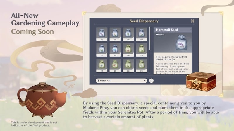Players will be able to use a new Seed Dispensary container given to them by Madame Ping in order to grow plants and make their Serenitea Pot feel a little more like home.