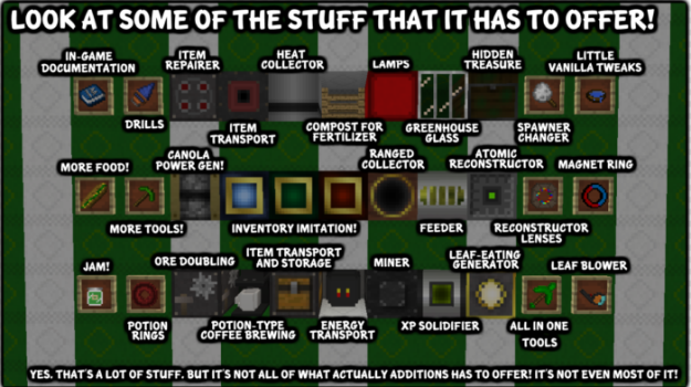 If you’re not into machinery so much, and farming’s more your thing, Pam’s Harvestcraft is a must-download for Minecraft 1.12. It introduces tons of new ways to make use of the land around you agriculturally – 60 new crops, beekeeping, markets, and so much more. It also adds a few quality-of-life changes to base-game farming which, once you get used to, you’ll never want to go back.