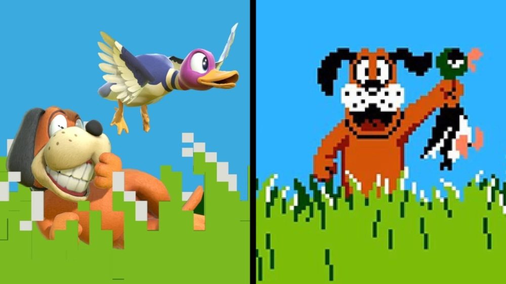 Super Smash Bros. takes the only two characters from the Duck Hunt game and combines them into one character: Duck Hunt. In that game, you use the NES Zapper controller to shoot down ducks while your dog ‘companion’ laughs at you when you mess up.
