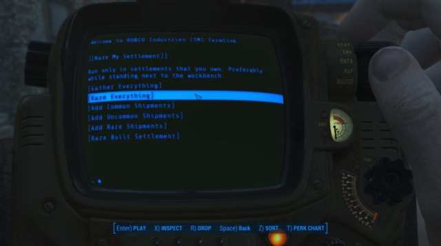 The mod comes in the form of a holotape named “Raze My Settlement”, which allows you to address the objects and junk in your settlement en masse.