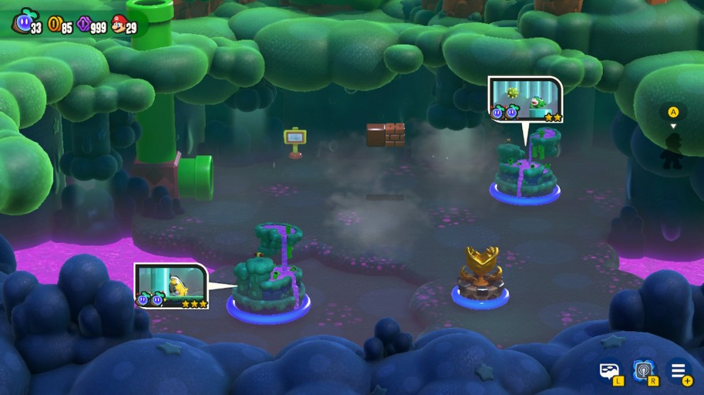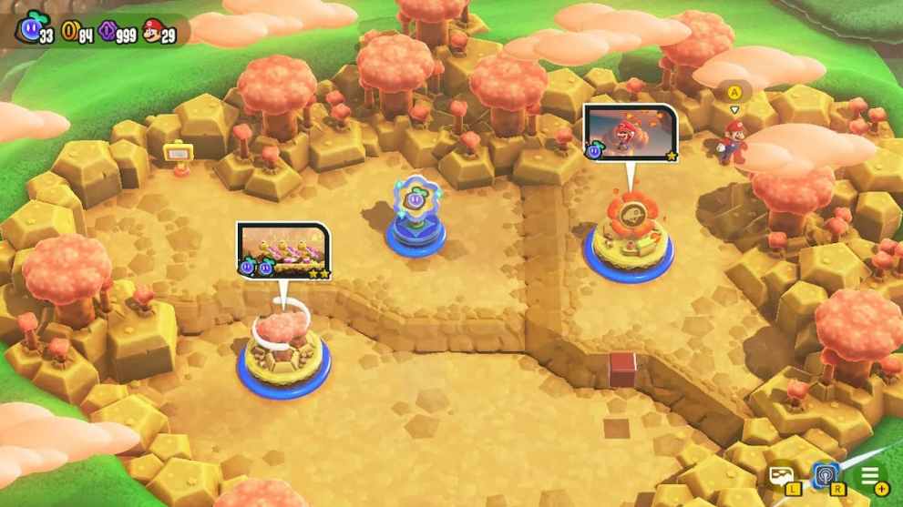 This’ll take you to the previous world, Bright Falls, but it’s inside one of the uniquely shaped mountains. Just move towards Toad to talk to him and he’ll give you 100 Flower Coins.