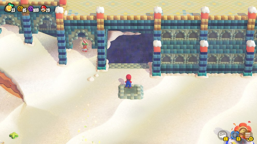The warp pipe will lead you to an ice area using the classic “?” indicating a sequence break. This is because you’ve landed in the second world called Puff-Bluff Peaks. Captain Toad is to the right and he’s gazing out over the icy mountains. Talk to him and he’ll give you 50 Flower Coins. The real reward is hearing his theme song play, though.