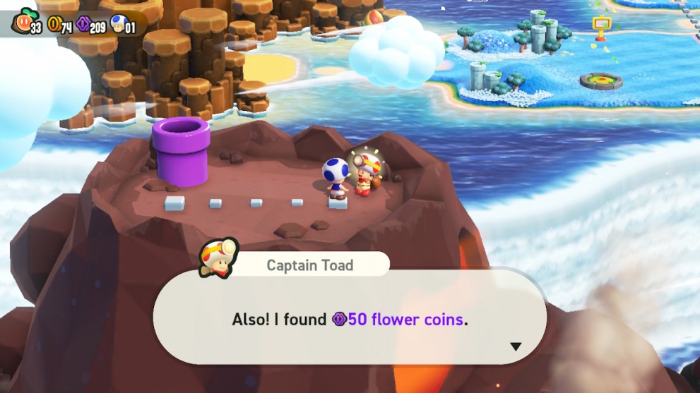 You’ll take the hidden exit and open a new path in World 1 leading to a warp pipe. Take the warp pipe and it’ll lead you to Captain Toad standing on top of Deep Magma Bog. He gives you 50 Flower Coins.