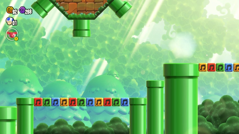 When you see the three pipes up above, use the musical block runway to the right to jump all the way on top of the three pipes to reach an off-screen platform leading to a red pipe.