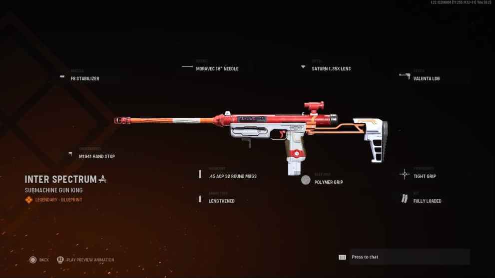 - Legendary “Inter Spectrum” SMG Blueprint – SMG with a high damage rate and aim-down-sights playstyle (Tier 95).