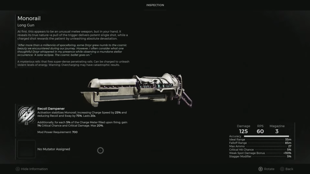 • Recoil Dampener:  Activation stabilizes Monorail, increasing charge speed by 25% and reducing recoil and sway by 75%. Last 20 seconds. For each 5% of the charge meter filled upon firing, 1% of the critical chance and critical damage are gained—Max 20.
