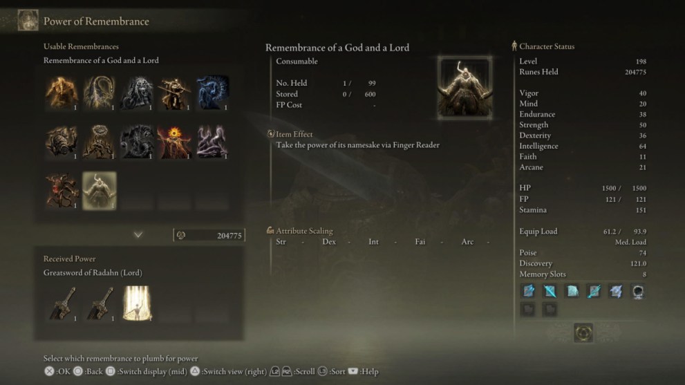 Alternatively, you can use the Remembrance to create the Rellana’s Twin Moons sorcery. So long as you have the 72 Intelligence needed to use it, you can bombard foes with giant moons of Glintstone energy.
