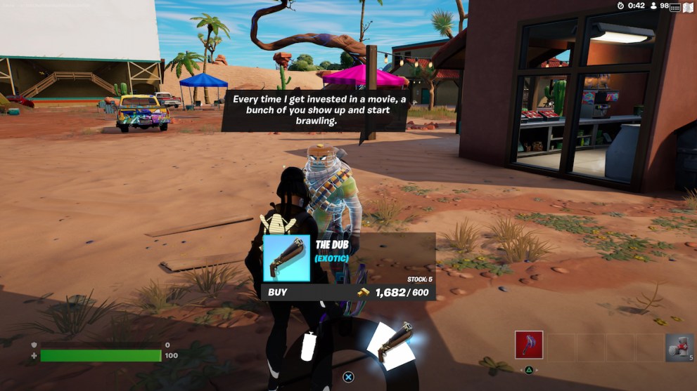 The Dub is bought from Mancake in Rocky Reels for 600 Gold Bars. This is one of the most tricky purchases to make considering the neverending popularity of Rocky Reels as a landing location.