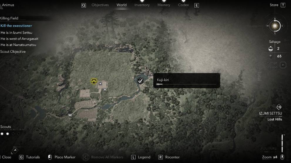 The second Kuji Kiri location can be found on the right side of Tomiko’s Homestead in the Lost Hills of Izumi Settsu. You’ll head here as part of the main quest when you unlock your Hideout. Head to the right towards the waterfall and you’ll see the orange bell icon for the Kuji Kiri location. If this is your second Kuji Kiri, you will get a memory of Naoe helping the Igans in the first battle against Oda Nobunaga’s son and facing one of his warriors in a boss fight.