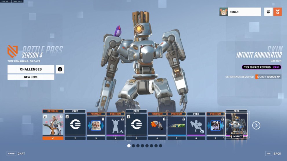 Bweep Bwoop! Bastion is back with a new Epic skin, Infinite Annihilator, which will be available as a free reward through the Battle Pass, unlocking at Tier 10. This new look throws Bastion’s beloved hat away and rebuilds him with a more metallic sci-fi bot appearance, complete with an adorable little alien bird variation of Ganymede to keep our robot buddy company.