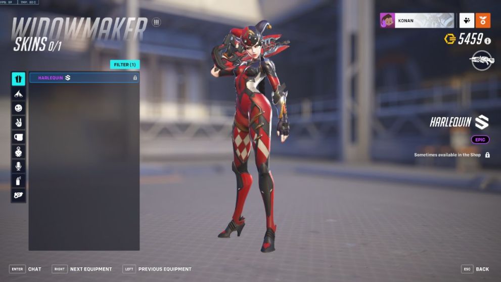 Another addition to the limited-time store skins set to release throughout season 4 is Widow’s Epic Harlequin skin, one of the few skins not falling into the Space Opera/Starwatch or Thai New Year seasonal themes. This one is an entertaining addition to Widowmaker’s collection, especially because it reflects a slight resemblance to fellow femme fatale villain Harley Quinn.