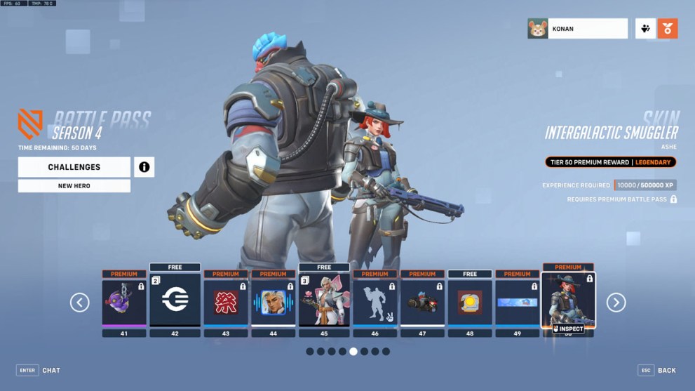Our beloved Deadlock Gang leader shows up again this Season 4 with a Legendary Intergalactic Smuggler skin, putting the perfect sci-fi Space Opera spin on Ashe and B.O.B. Intergalactic Smuggler unlocks at Tier 50 of the Premium Battle Pass, allowing players to equip a variant of the sniper with red hair, muted gray clothing, a hat drenched in alien slime, and best of all, alien B.O.B. This theme works perfectly for Ashe and her backstory in the Overwatch world and makes an exciting addition for any D.P.S. main to add to their collection.
