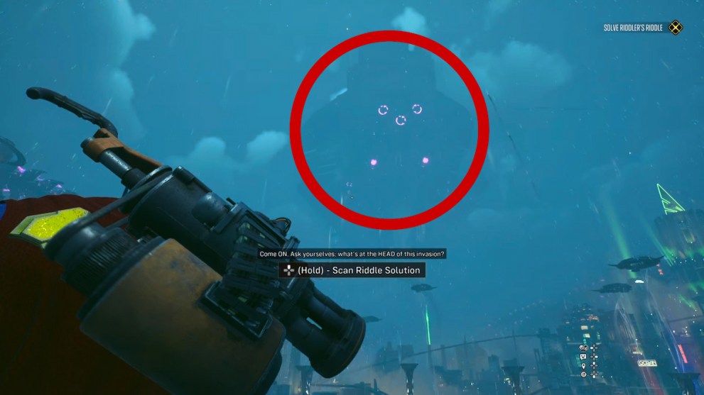 The first riddle can be found at Bakerline after you receive a call from the notorious Edward Nigma. It will begin with the line, “My shadow falls across the city, my piercing gaze knows no pity.” The answer is none other than the giant Brainiac figure in the sky, which you’ll need to scan to complete the trial.