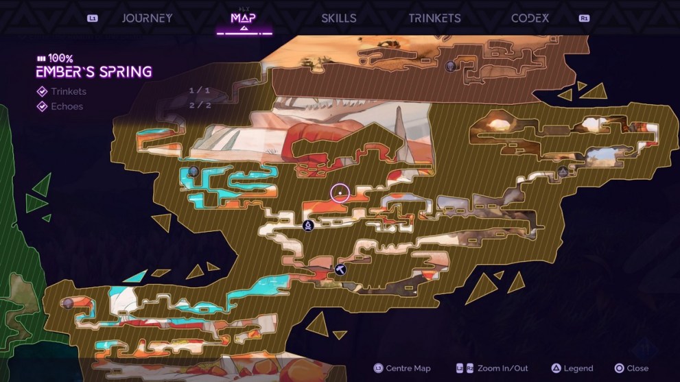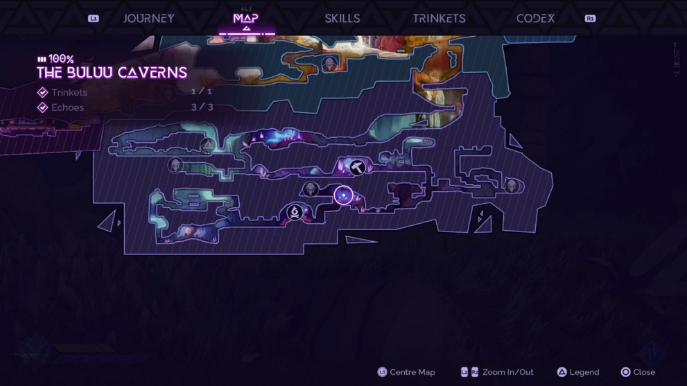 Located just below the Wanderer’s Pass, players will be able to find a total of three Echoes and one Trinket in the Buluu Caverns. The latter is represented by the triangle symbol on the map, and requires players to complete a platforming challenge before claiming their prize.