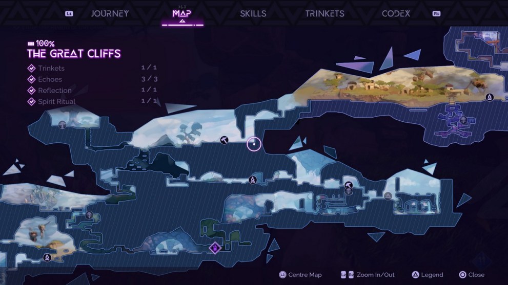 Now things get a little bigger and more confusing. The Great Cliffs contains many interesting sights, including one Trinket, three Echoes, one Reflection spot, and one Spirit Ritual location. Reflection spots are giant trees with an alcove beneath them, and visiting one will increase Zau’s maximum Health. Simply look for the giant trees as part of the background art on the map.
