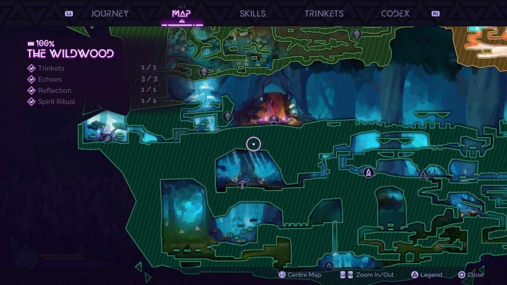 Next up is The Wildwood, where three Echoes, one Trinket, one Reflection spot, and one Spirit Ritual location are lying in wait for Zau.