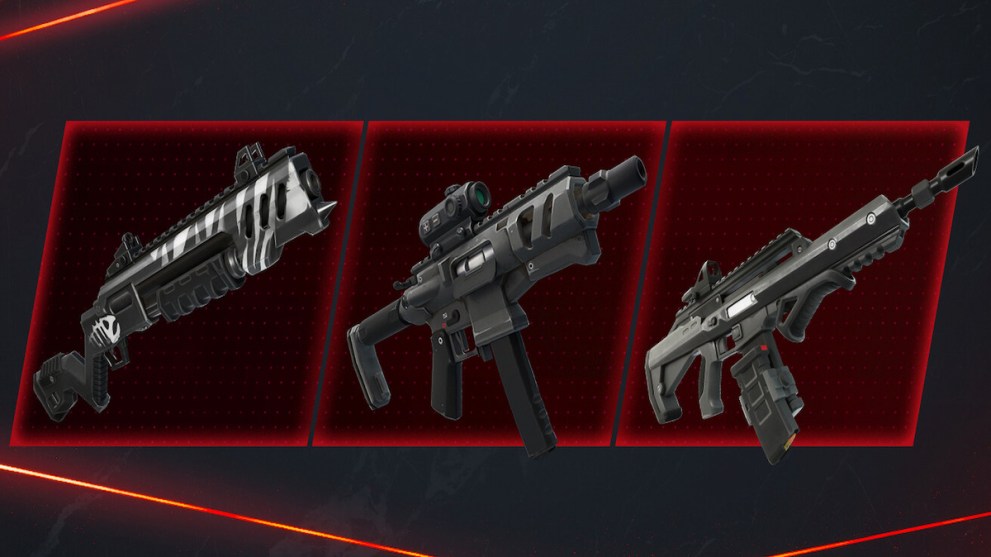 The three new guns (in order from the image above) are the Infiltrator Pump Shotgun, Scoped Burst SMG, and Twin-Mag AR. If you remember the Twin-Mag SMG from Chapter 4 Season 1, this will be a suitable new version.