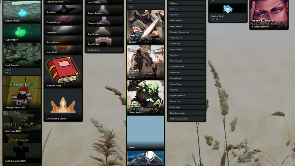 The Anime Card Battle Trello board is rich with useful information if you are playing this Roblox experience. First, there is a column with cards detailing items and NPCs that you can find in the game, such as Luck Potion and Luck Sword, along with the Merchant and Luck Fountain NPC. At the moment, you will find some basic information about them, such as where to find and use them.