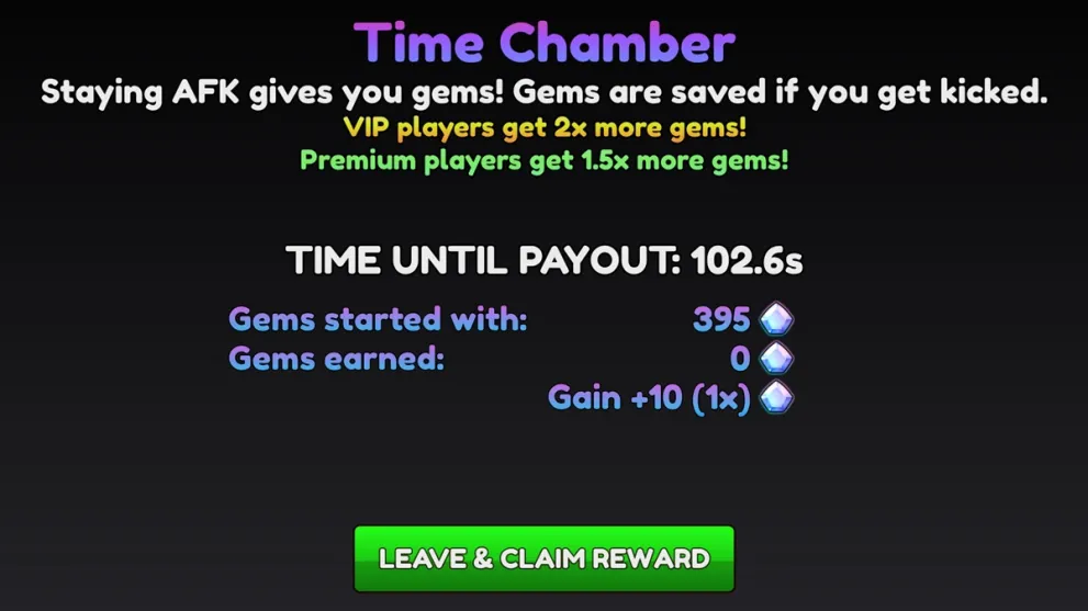 What to do now? Well, basically go about your day. When the counter resets, you will automatically get 10 Gems. If you’re a Premium user then you will up that number to 15 Gems, and if you’re a VIP you’ll get 20 Gems. When you think you have farmed enough, click on the green button, get your Gems, and be transported back to the lobby.