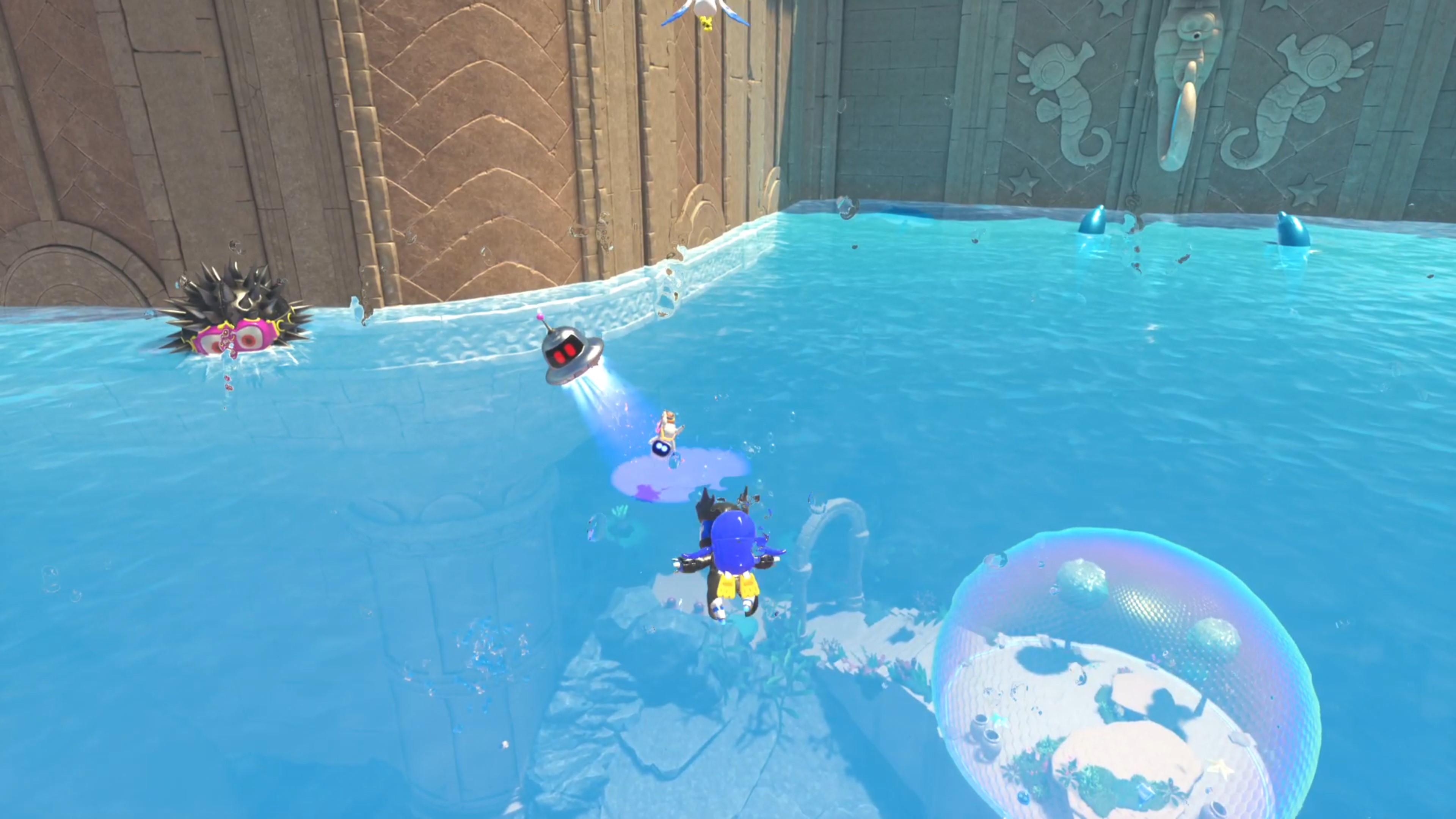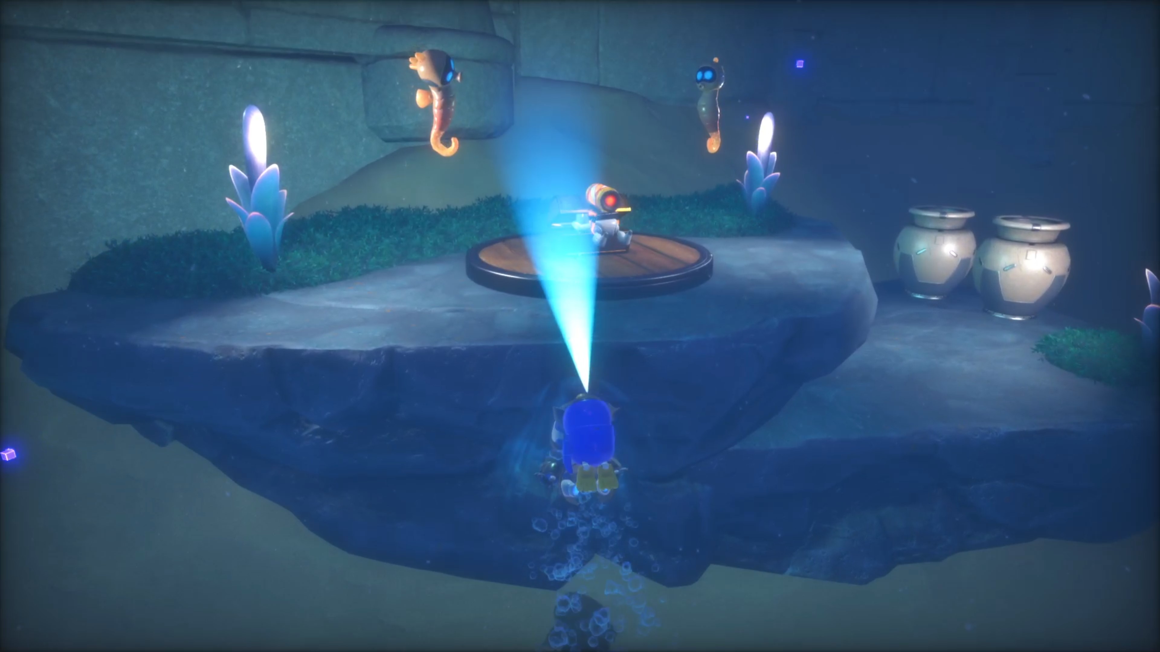 Just above the starting zone of this open area, swim up to the surface to spot a UFO carrying the bot. Try to aim for it and leap out of the water, or use hover to adjust your position before attacking.