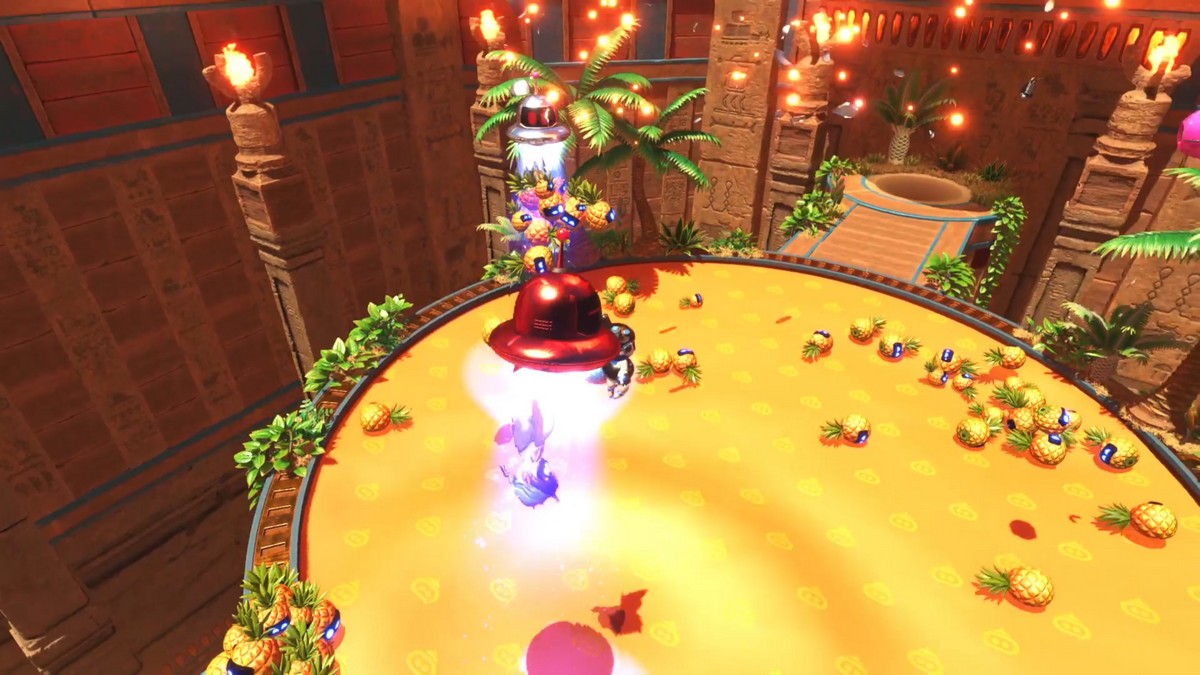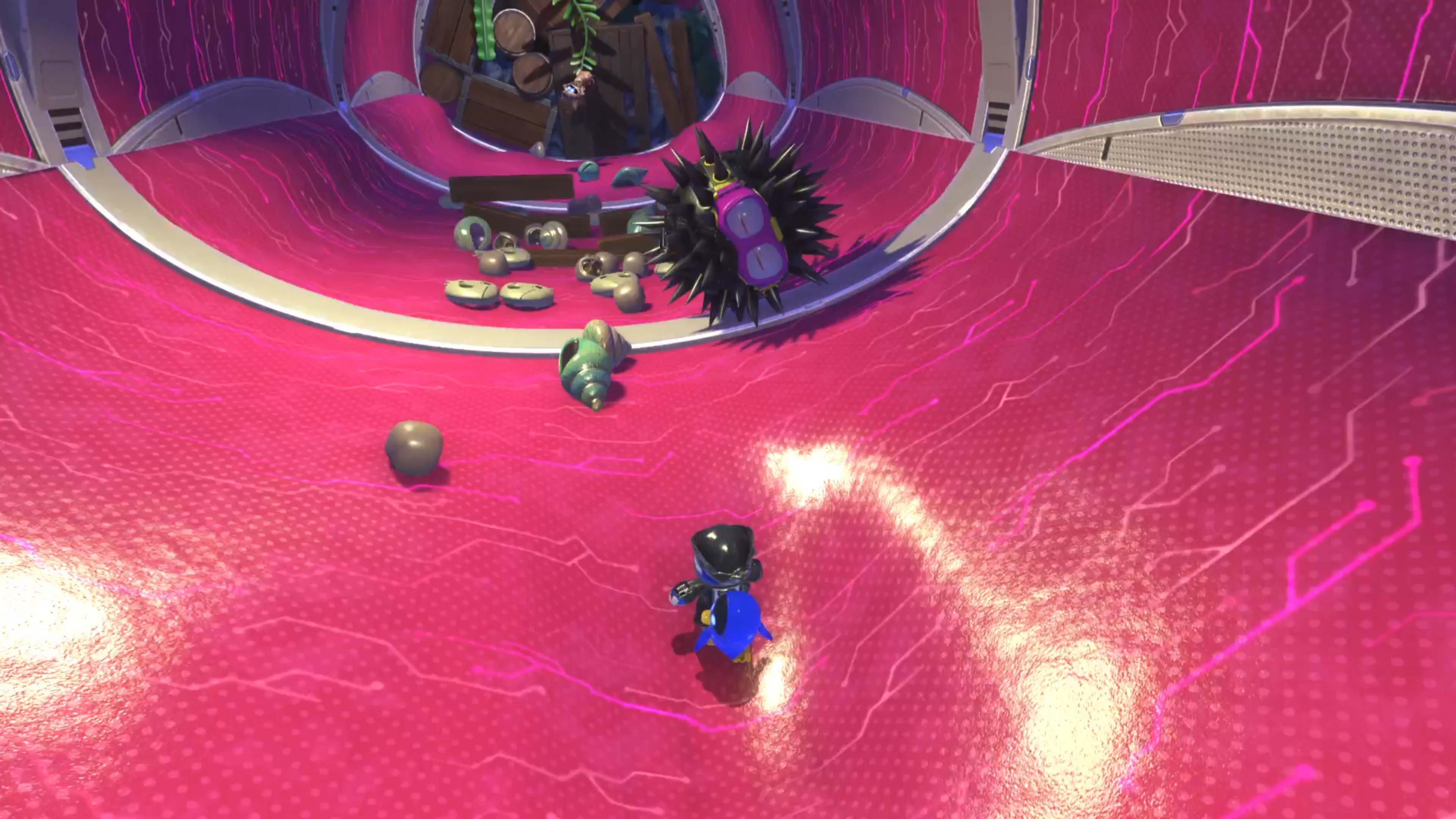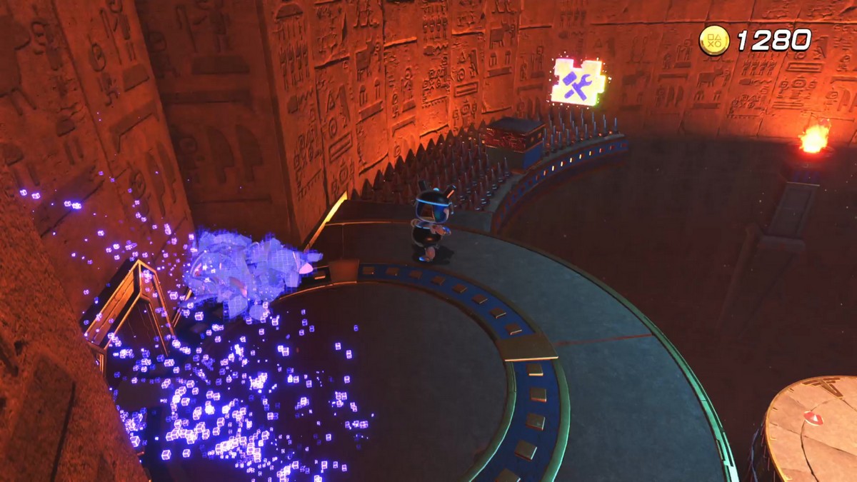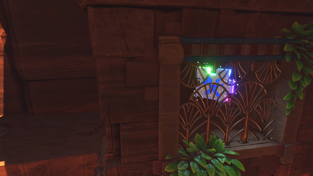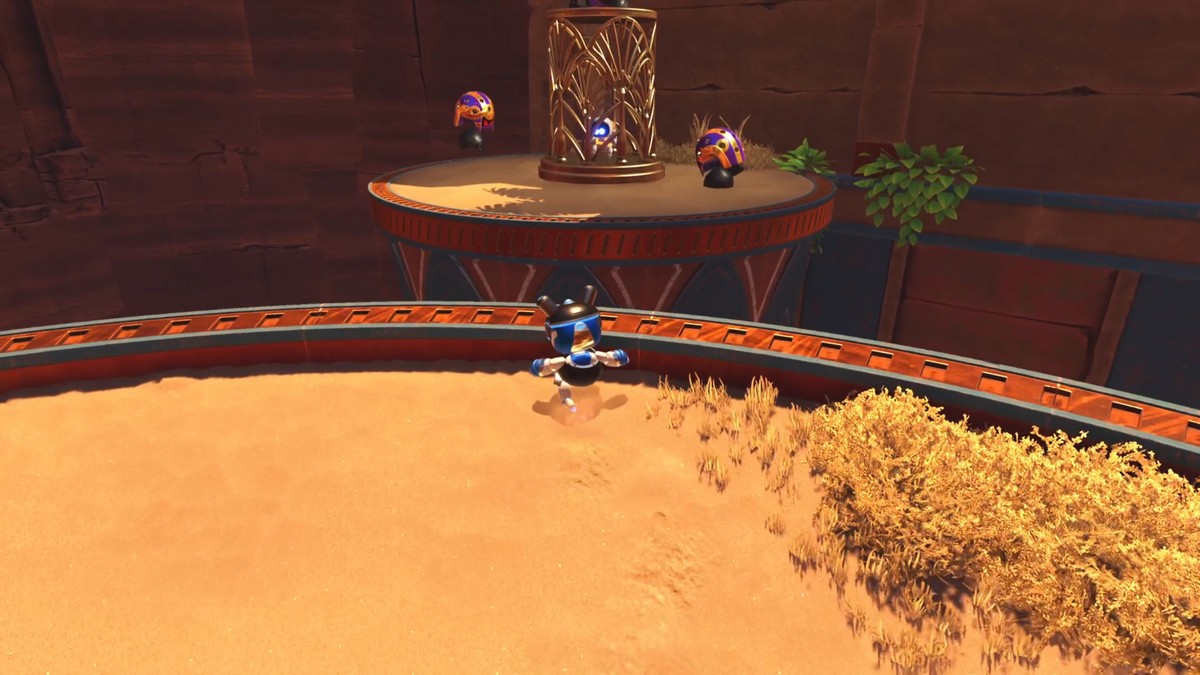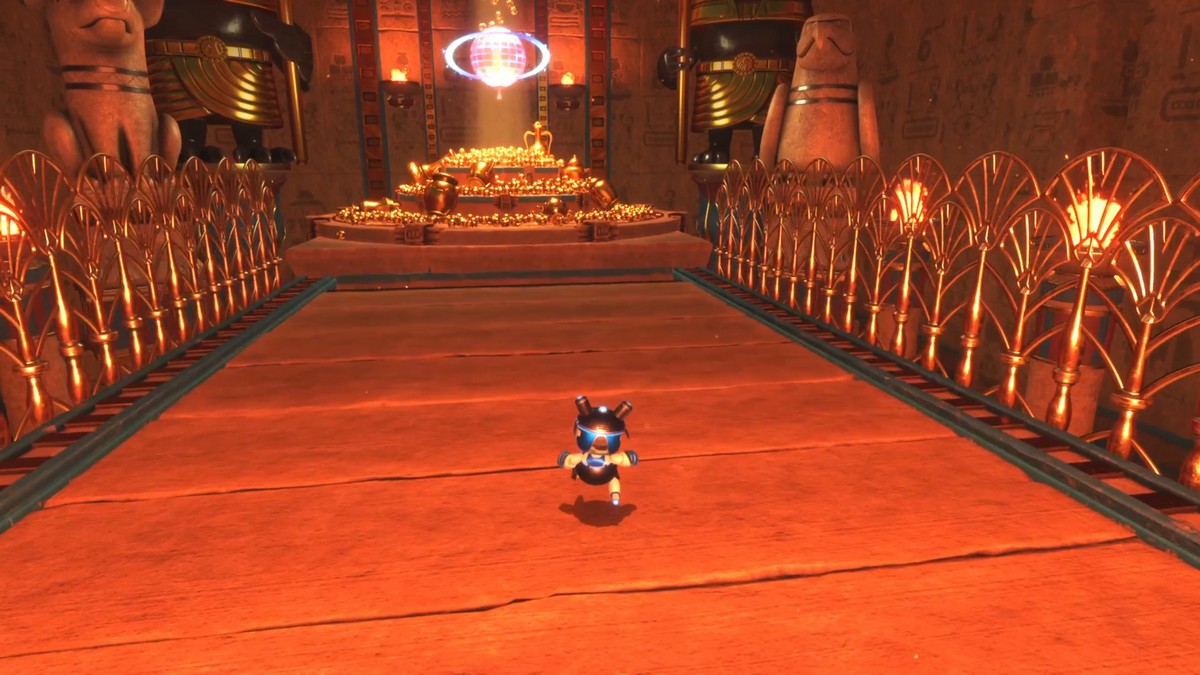 Now, turn around and go back to where the first bot was. Spot the flower pot in the distance, and float your way there. Use the shurikens to cut down the bamboo, and use the laser to fill up the device’s outer ring, which will reveal the disco ball for the secret level.