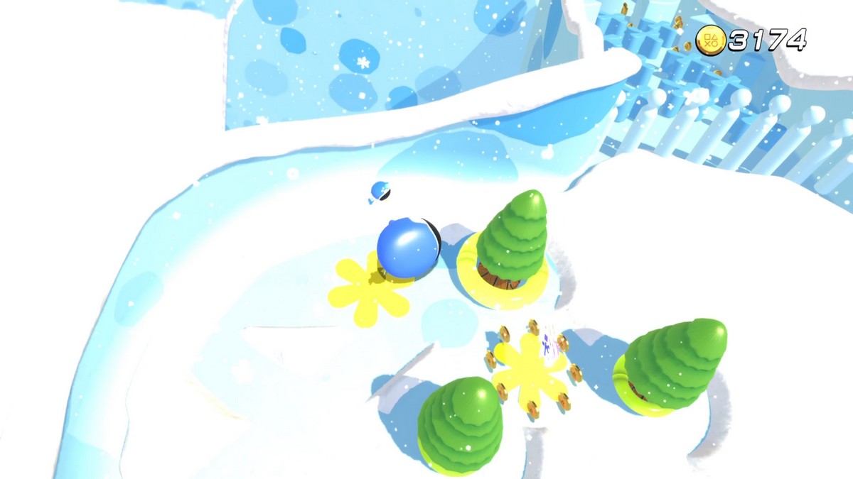 Once you reach the snow-covered area, keep rolling among the trio of trees to the left to uncover a flower pattern. This will reveal the third puzzle piece.