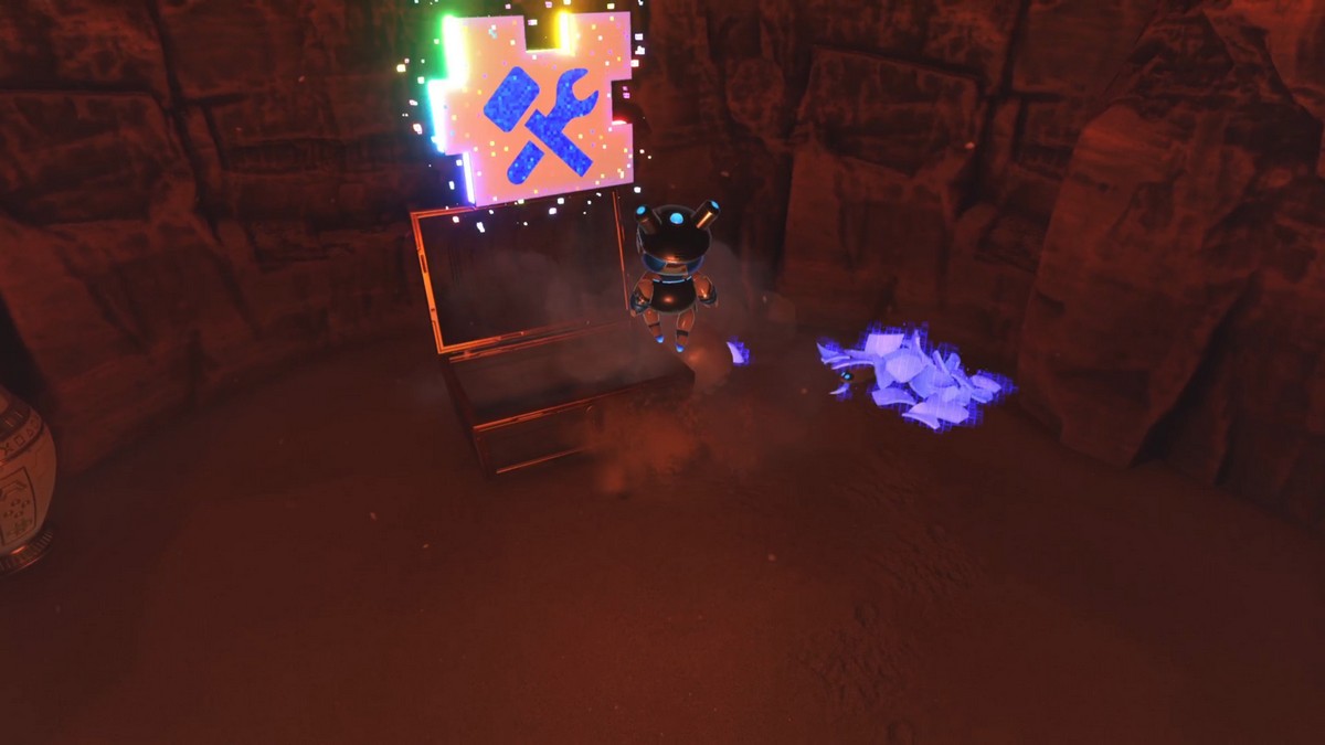 From the previous area, turn around to find a wrecked ship. After crushing the lock, power through the nearby walls to find this bot trying to open a treasure chest.