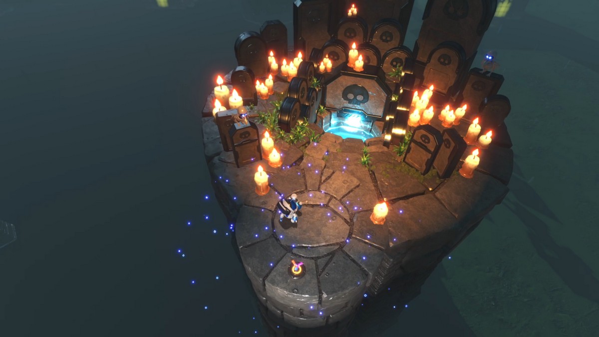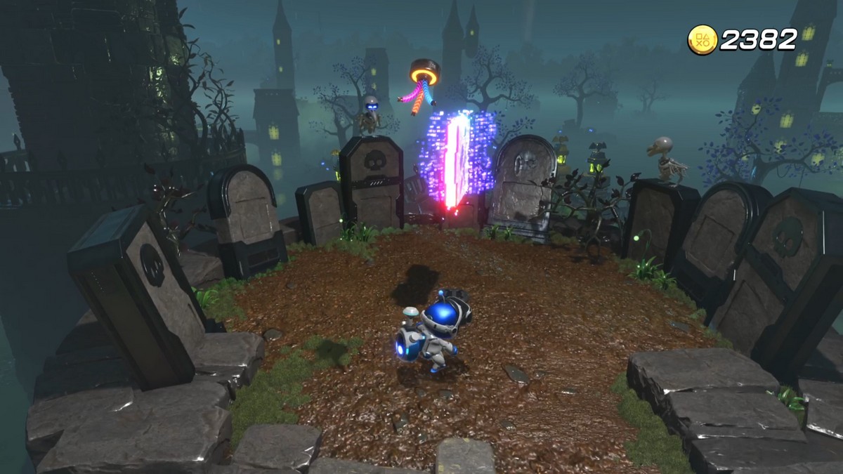 Upon crossing the area with the floating tombstones, look to the right for a structure you can climb to the top. Notice the crushing gates and the door puzzle, so use the time-stopping power to get past it, and then do so again to rescue the bot stuck on floating furniture.