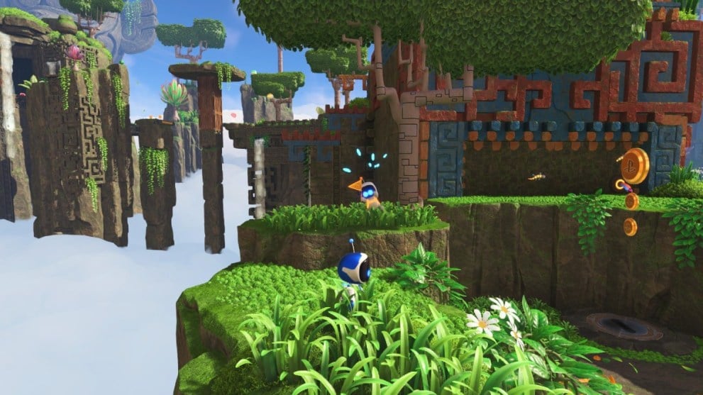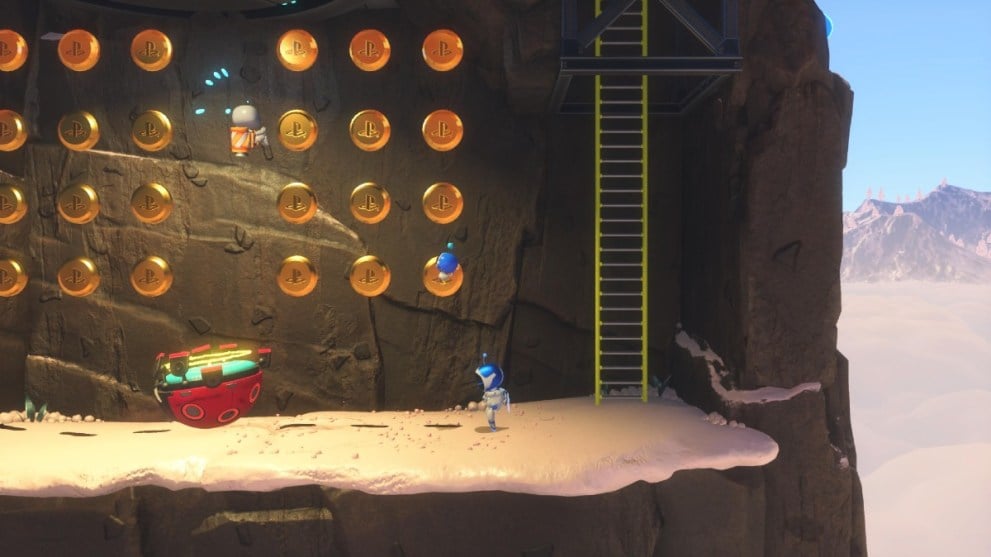 Continue through the level up past the bounce pad and through the next checkpoint. Climb the ladder, collect the first puzzle piece, and pull the wire to unlock another bounce pad. Jump up it and you’ll see a Lombax-dressed bot stuck to a tree, guarded by a purple enemy. This is the first of many PlayStation-themed bots in Astro Bot!