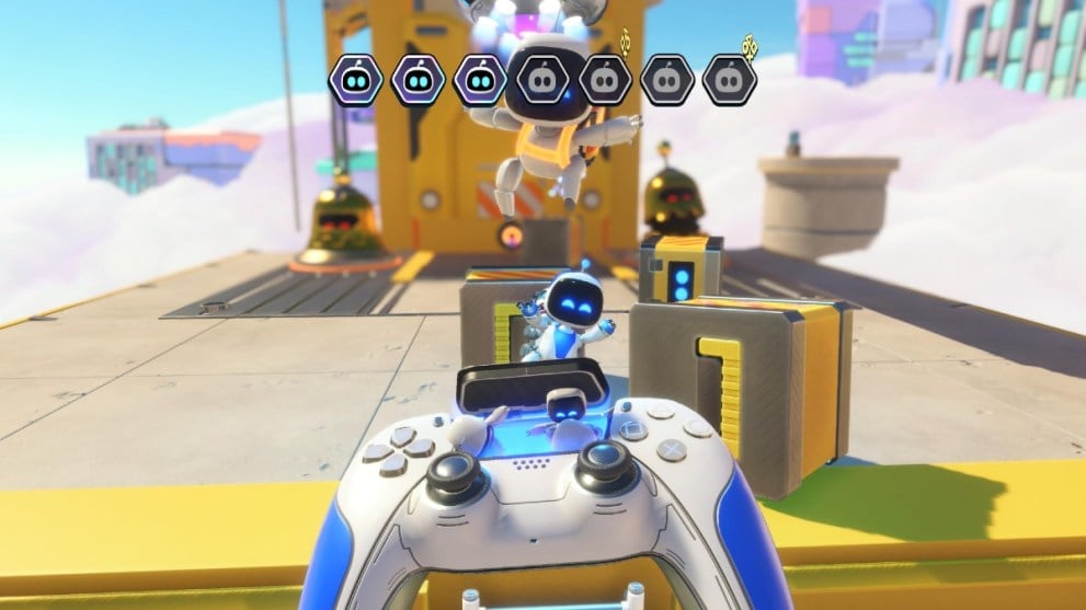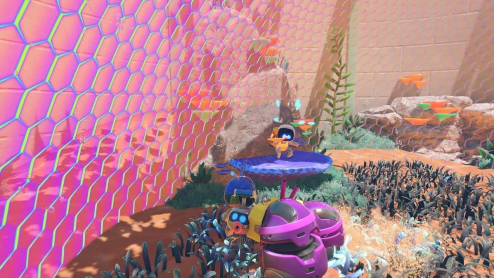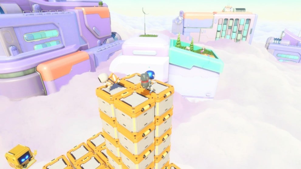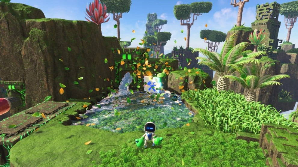 Once you’ve found the fifth bot, there’s a red block to pull on the right-hand side of the level. Doing so opens up a bounce pad and a small island to climb up, with the next puzzle piece sat at the top.