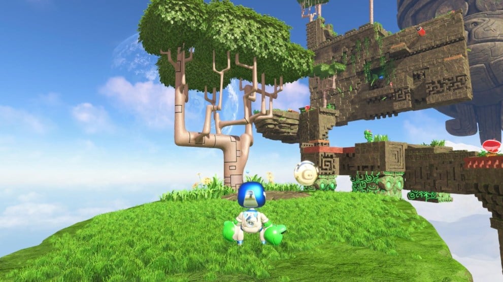 On the next island along, look for a blue bounce pad to the very left of the area. Hop up and free the bot stuck hanging from the tree by punching the tree trunk.