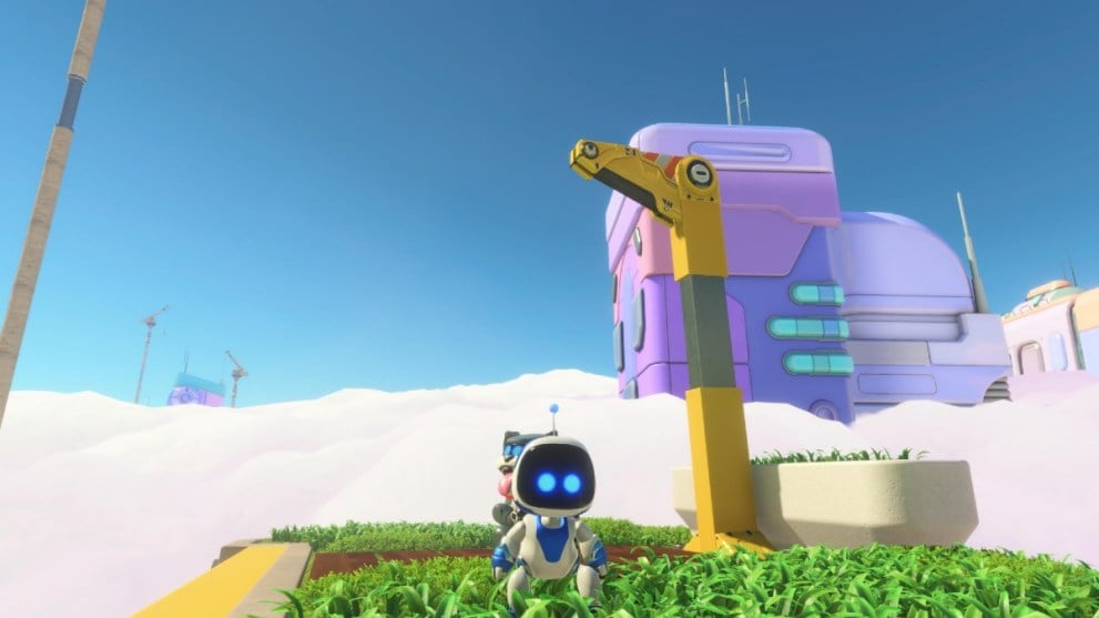 The first bot of this level comes as soon as you’ve crossed the two plates brought level with the ground thanks to some handy cranes. Clamber up the walls after them and head to the right to see a bot holding onto a pole.