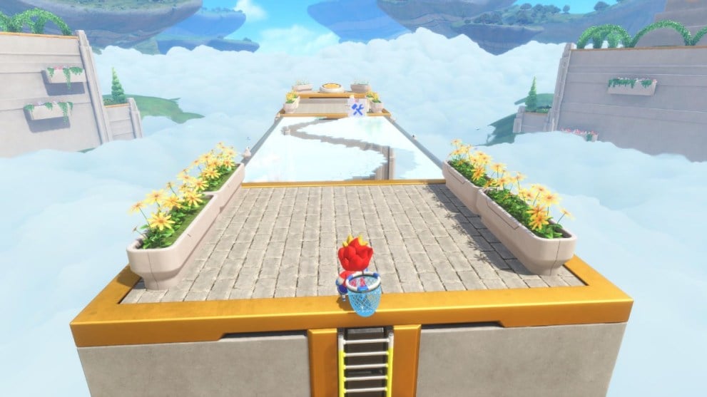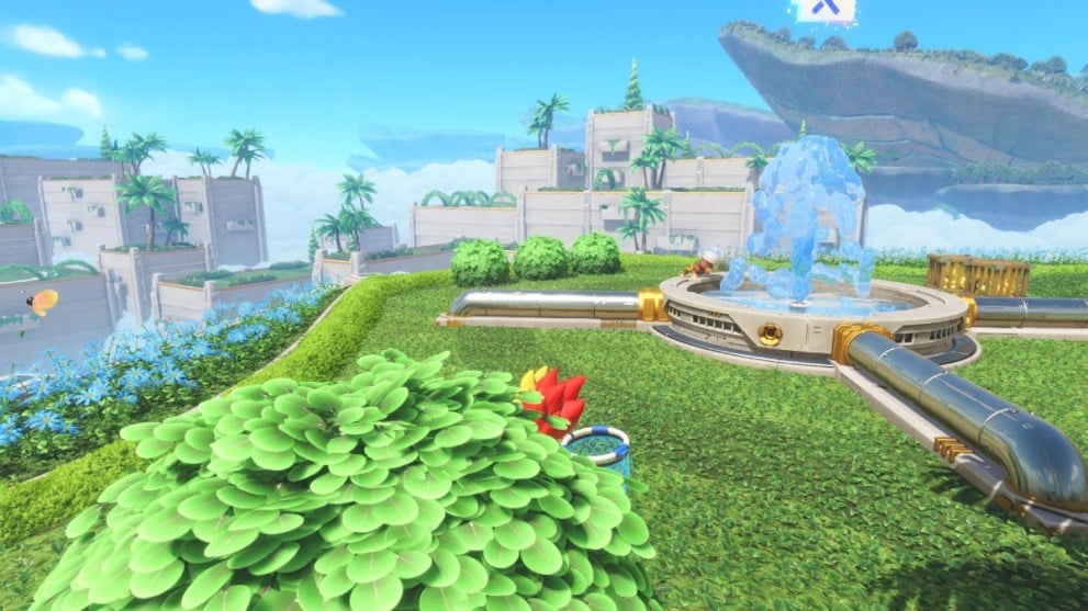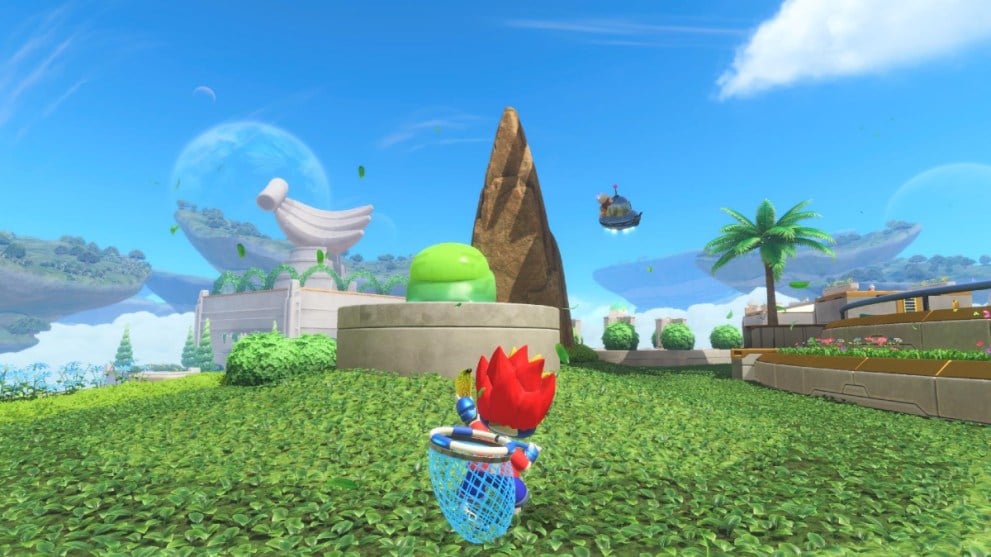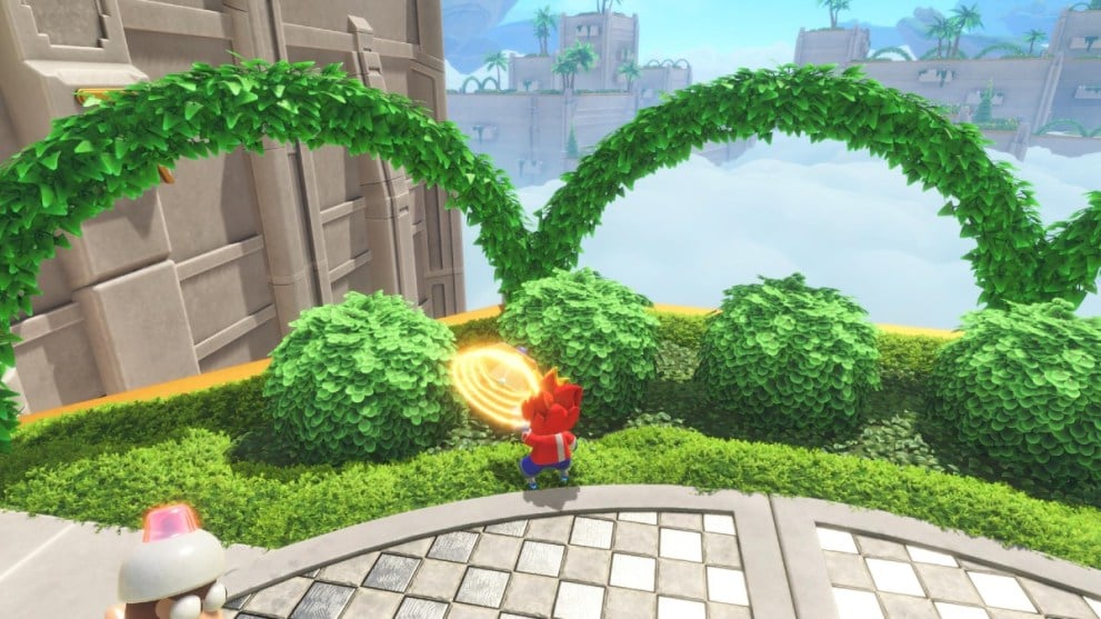 Along from that, you’ll see a triangular platform slightly above ground level. Defeat the slime next to it and pull the wire to reveal a flower you can use as a propeller by pressing Square. There’s a bot along this platform, so chase it and cut corners until you’re close enough to catch.